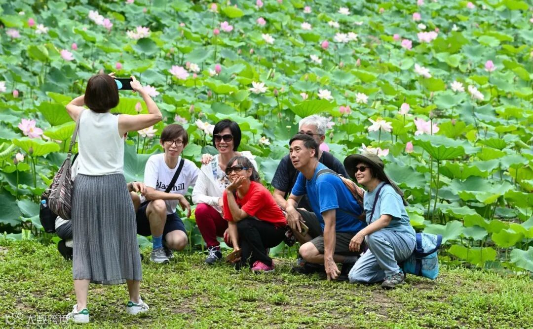 荷花盛开时节,绿叶荷花衬映着湖色山水,散发阵阵幽香,成为众多游客拍照打卡的背景。