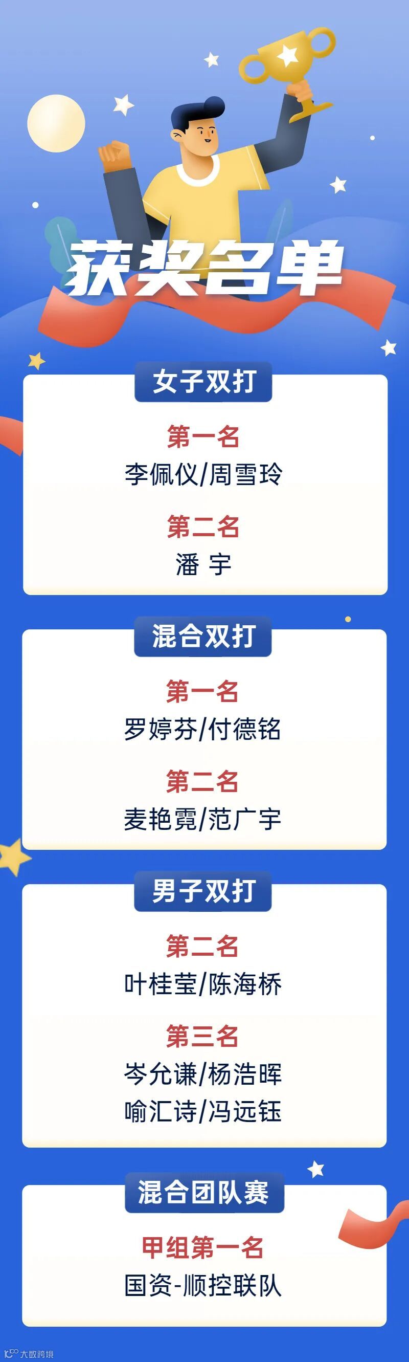 羽毛球赛分为单项赛和团队混合赛,单项赛于19日晚顺利完成,区国资局、顺控集团参赛运动员获得混合双打、女子双打第一名等多项名次,团队混合赛经过两天的激烈角逐,在小组赛和半决赛都以3:0的碾压性优势完胜,并在决赛争霸中夺得本届甲组混合团体赛冠军!国资-顺控联队的具体获奖人员名单如下: