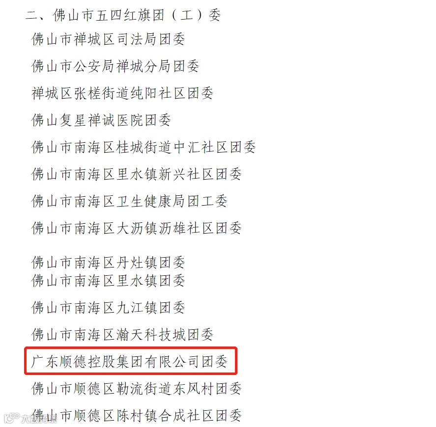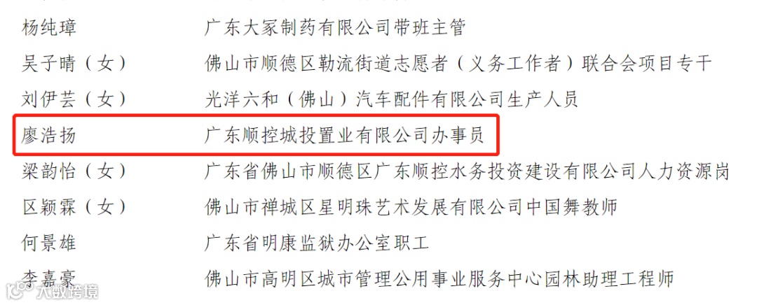 共青团佛山市委员会决定,授予广东顺德控股集团有限公司团委(下称“顺控集团团委”)“佛山市五四红旗团(工)委”称号,授予广东顺控城投置业有限公司办事员廖浩扬“佛山市优秀团员”称号。
