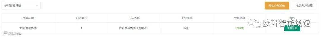 场馆可以在后台添加收款账户、添加欲分配的收款账户,并针对门店开启分账。