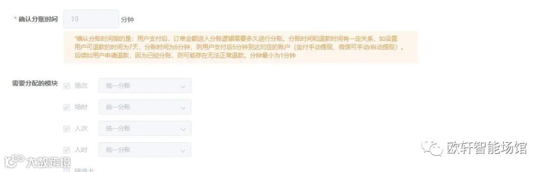 在与他方合作的情况下,可以用“分账”功能,将交易资金分给合作伙伴,例如场地分佣(某一场馆场地不收取租金,按照收入抽成)、租赁分佣(共享设备的租赁分成,比如欧轩智能场馆的租球机)等情况。