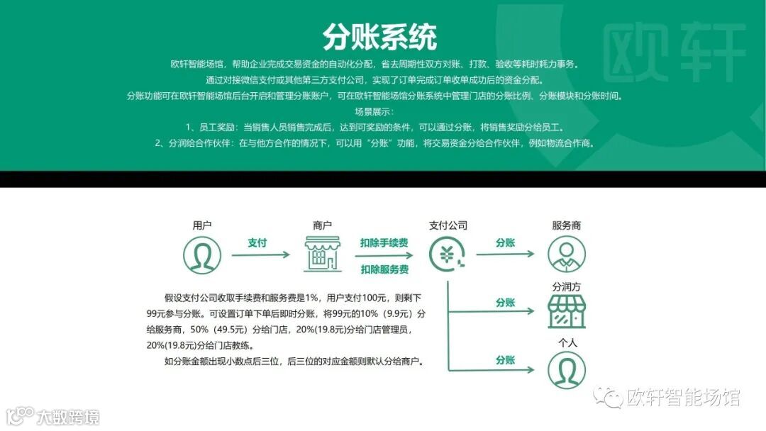为了解决场馆日常经营中产生的各种分账需求场景,欧轩智能场馆saas系统联合具备第三方支付牌照的合规支付公司(第三方支付牌照目前总共27家且不可再次申请,这也就是为什么像华为、拼多多都是以收购第三方支付牌照公司的形式获得支付许可)推出的,为了解决繁琐对账,收入分配的痛点而开发的管理效率系统。
