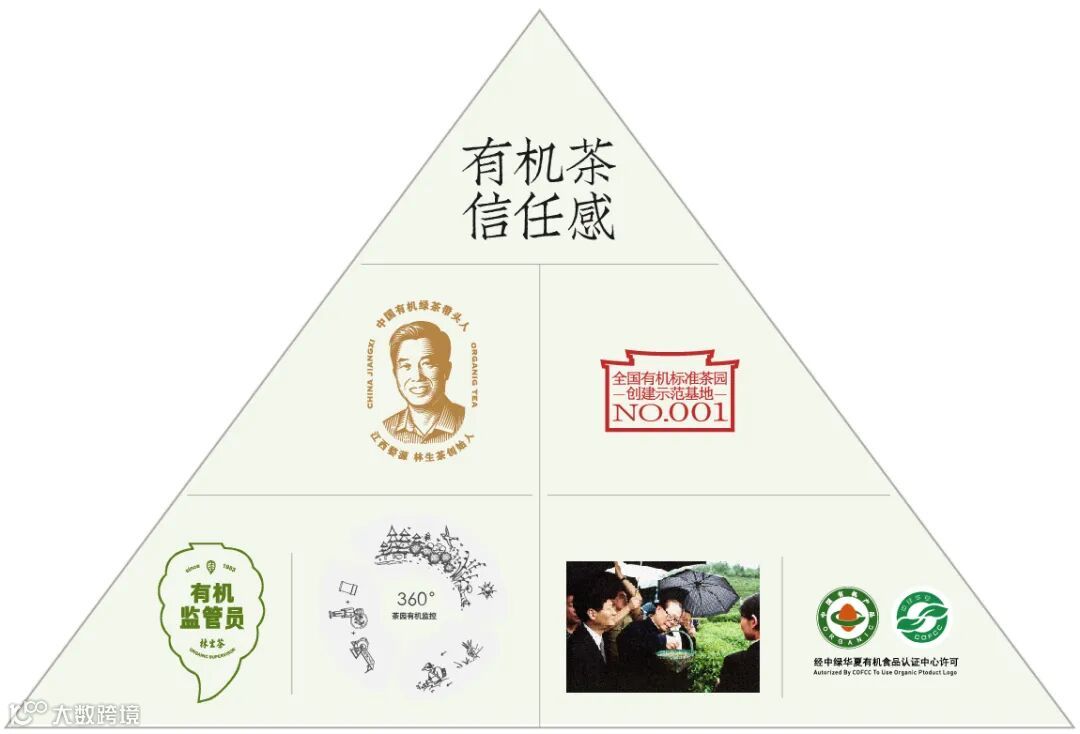 ▲ 林生茶中端系列“001” —— 命名 = “全国有机标准茶园基地001号”的信任状 = 001号,每次人们识别产品,都是对品牌购买理由的反复捶打。