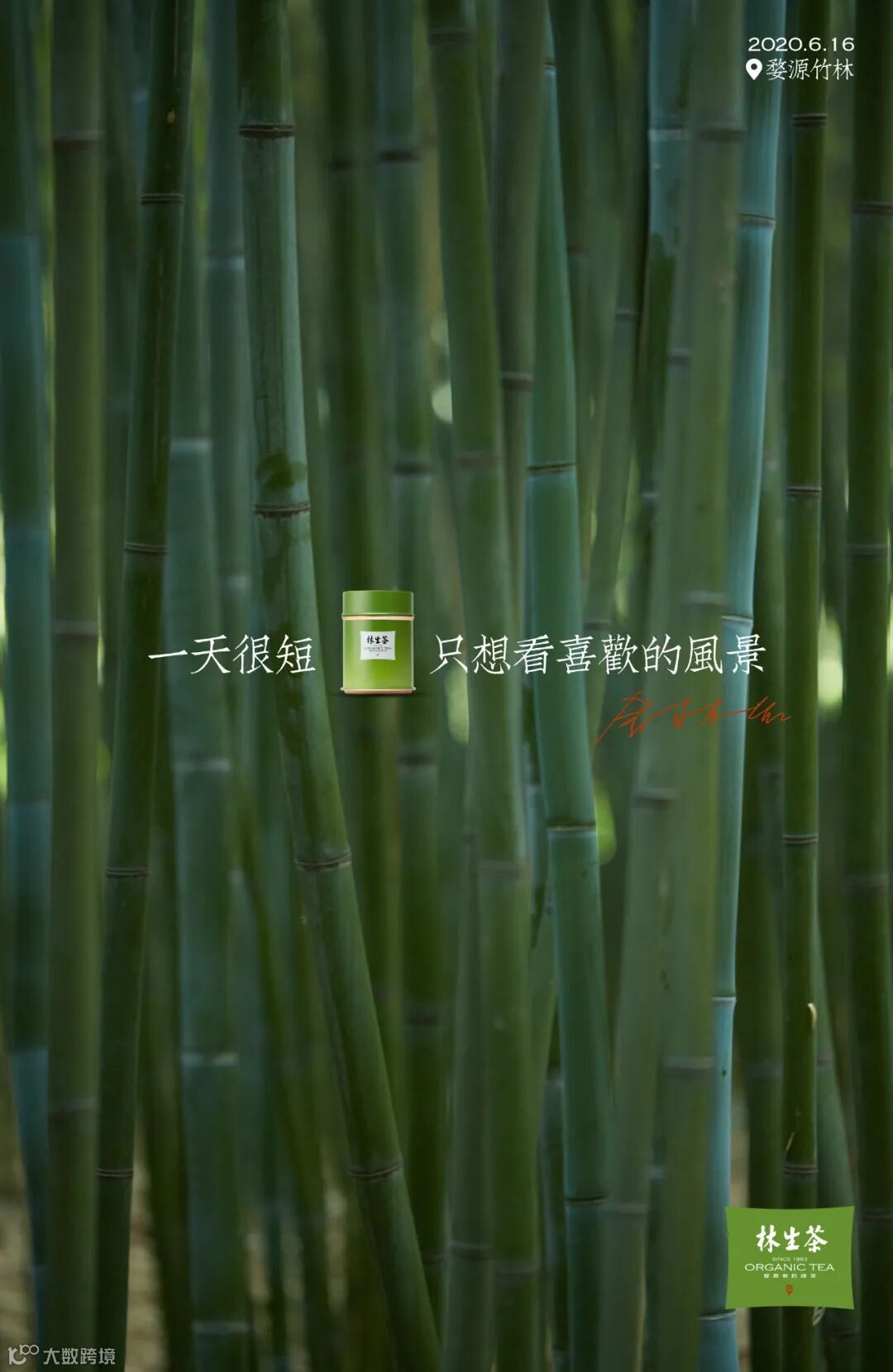 大自然把竹林刻画成一幅动人的画面,我们还原大自然的美景,把大自然带回家。成片竹林形成的天然“竹海绿”让林生茶明显区别于过去绿茶品类略显庄重的传统绿色,形成自己差异化识别,给人以清新活力的同时,也拉近了品牌和顾客的距离。