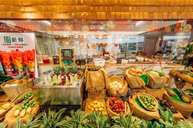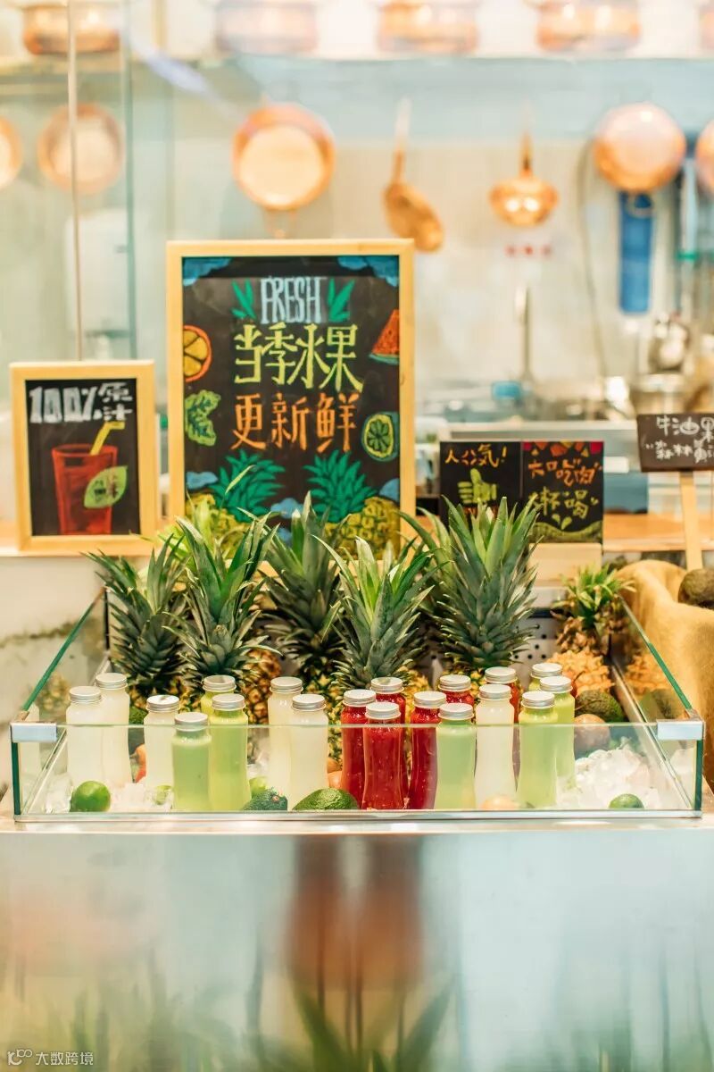 从餐厅外立面的市集展示,配合手绘的小黑板(去除工业化喷绘风格),配合芭蕉叶与新鲜食材的展示,反复强化:“新鲜看得见!”