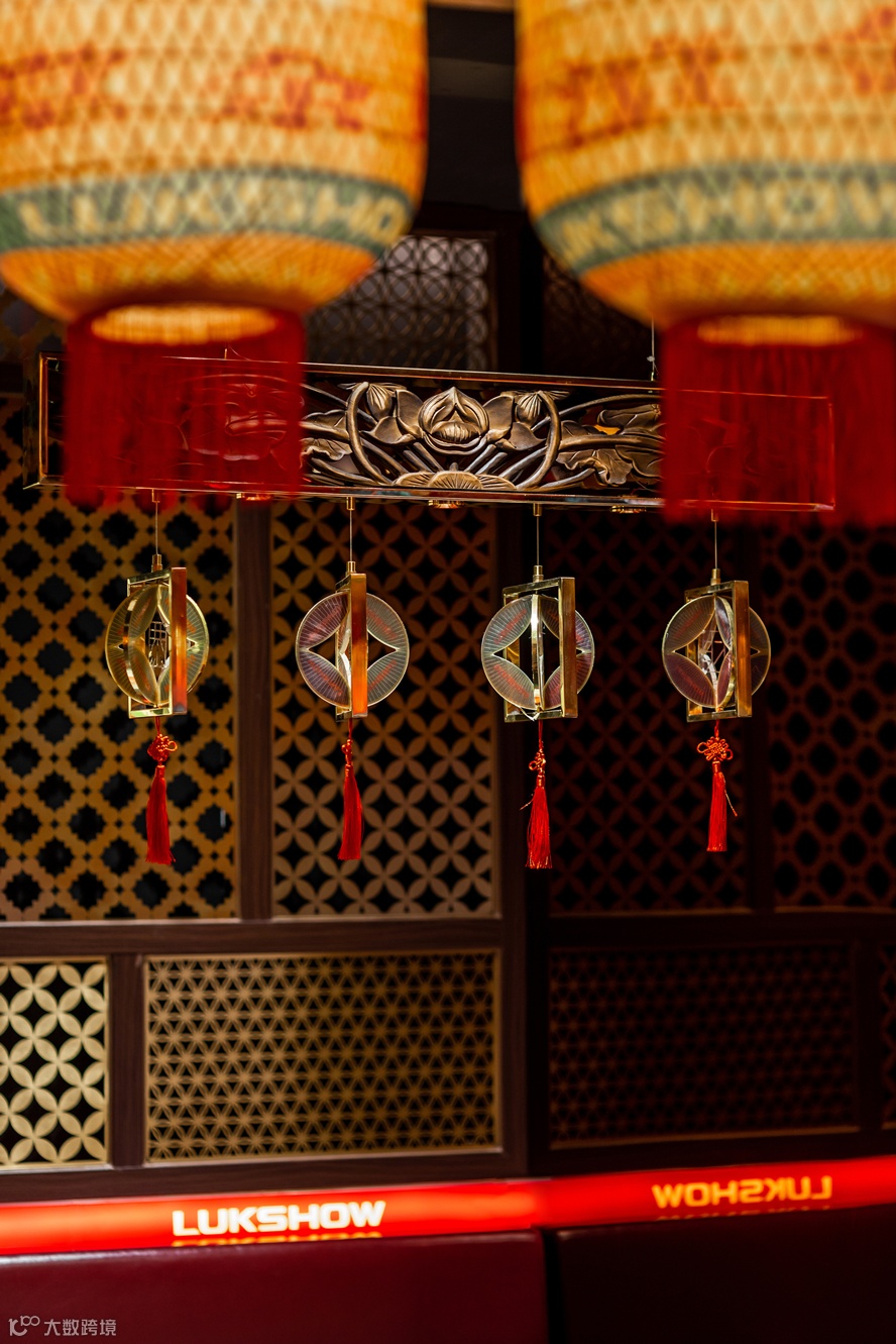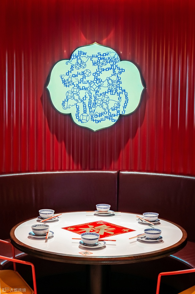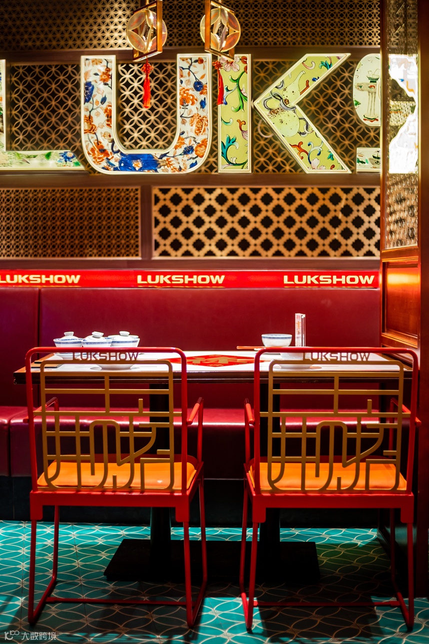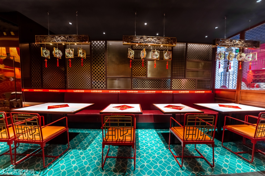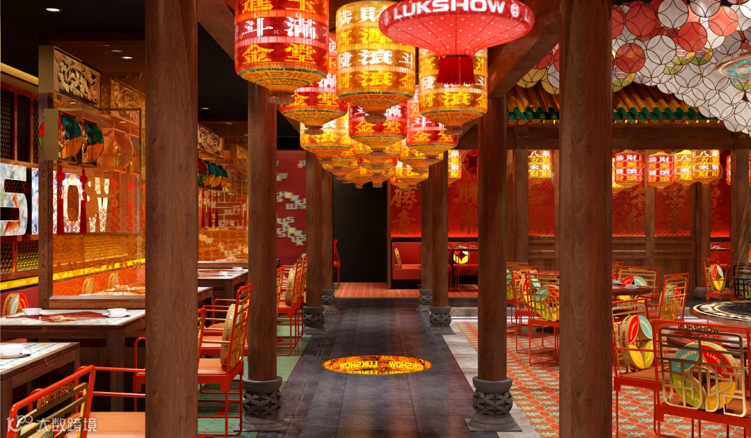 整体看:整个禄鼎记空间从外立面增加中式牌匾,进门处设置了财神影壁墙,顾客需要穿过影壁墙进入餐厅内部,而不是过去没有遮拦的展厅。门窗采用半封闭形式,提取了岭南门板线条与彩色玻璃融合,可以透过窗外隐约看到顾客用餐的热闹场景而不是直接看到,更能衬托空间热闹的氛围。