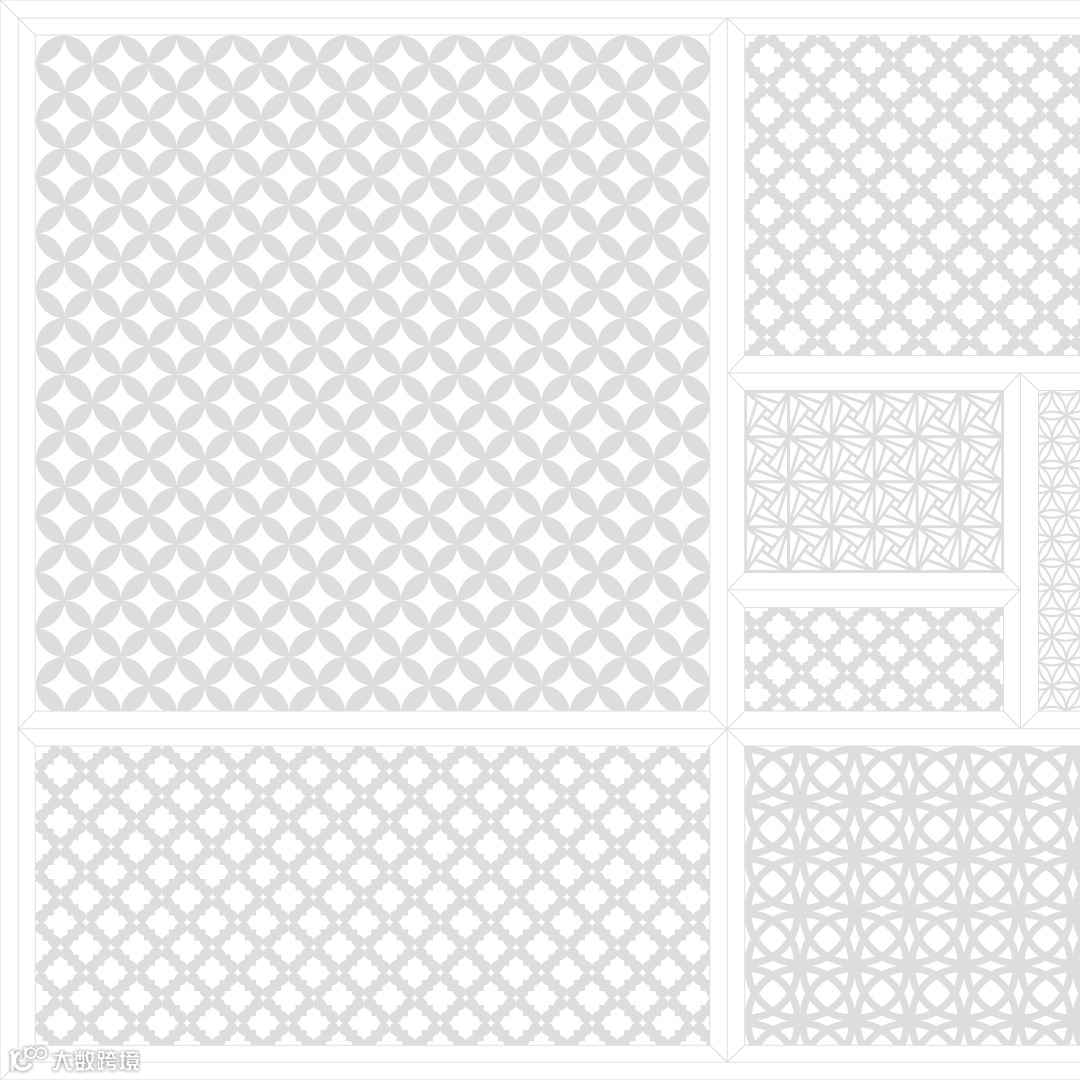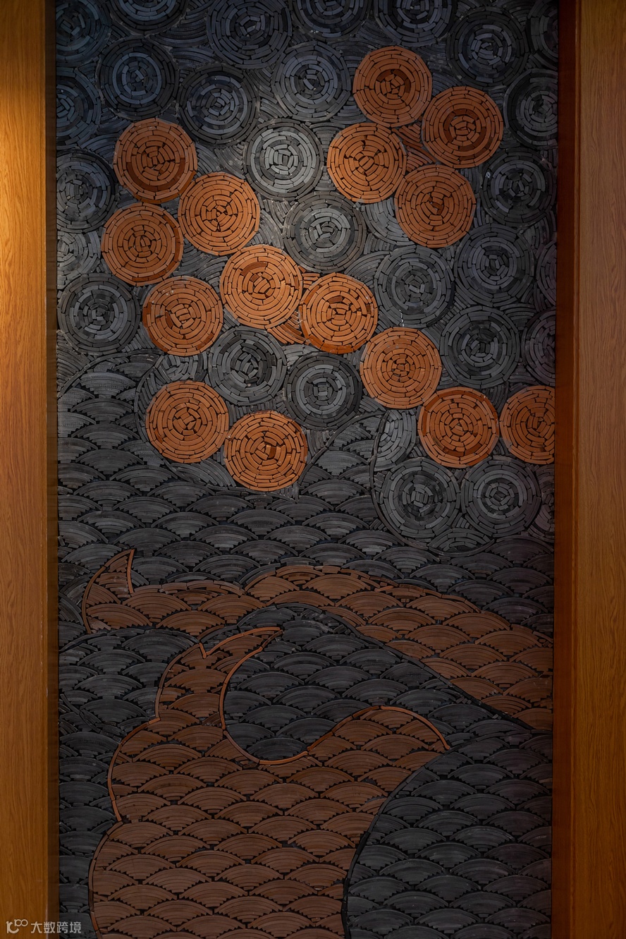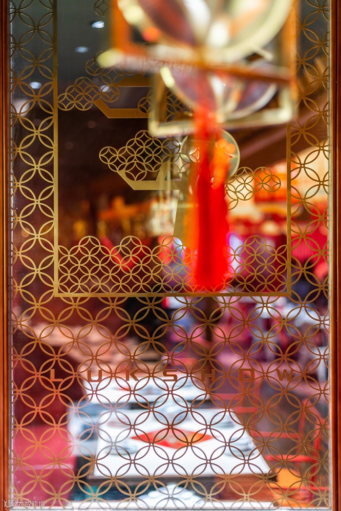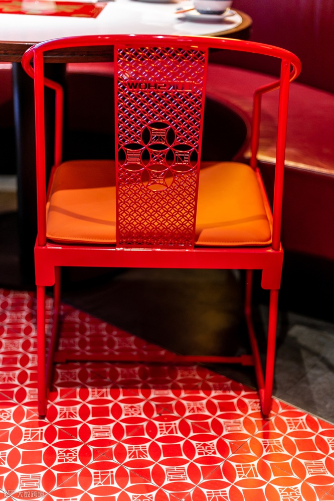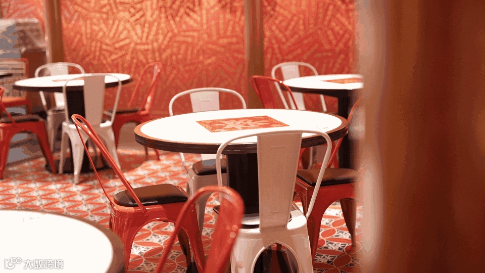 整体看:整个禄鼎记空间从外立面增加中式牌匾,进门处设置了财神影壁墙,顾客需要穿过影壁墙进入餐厅内部,而不是过去没有遮拦的展厅。门窗采用半封闭形式,提取了岭南门板线条与彩色玻璃融合,可以透过窗外隐约看到顾客用餐的热闹场景而不是直接看到,更能衬托空间热闹的氛围。