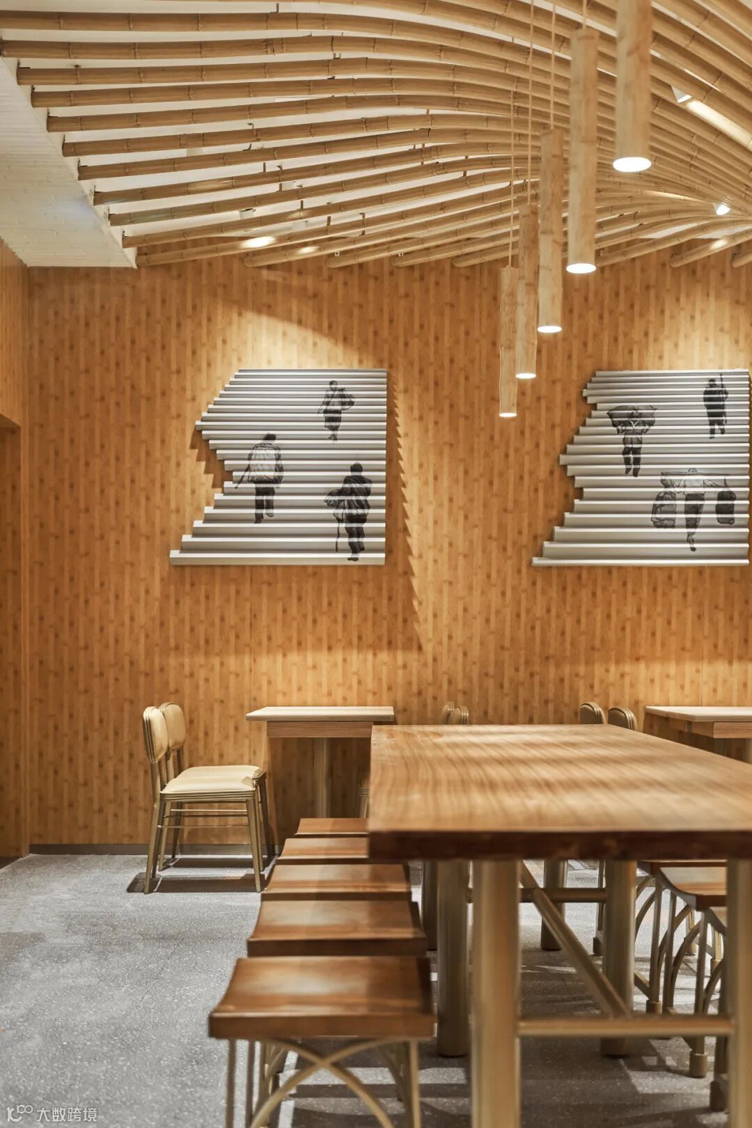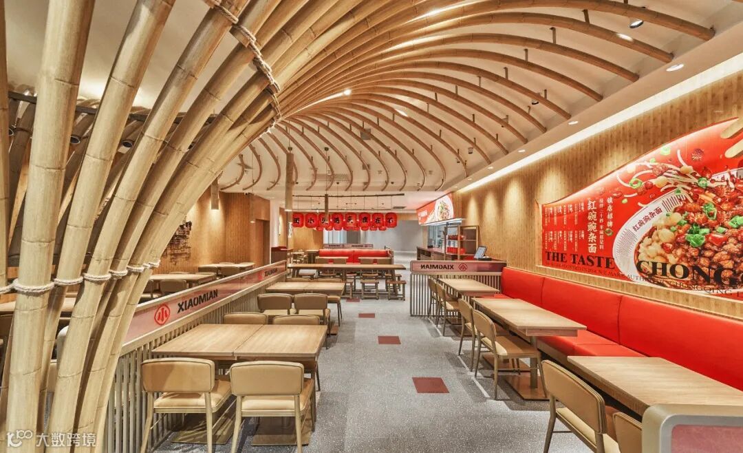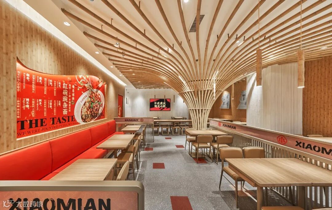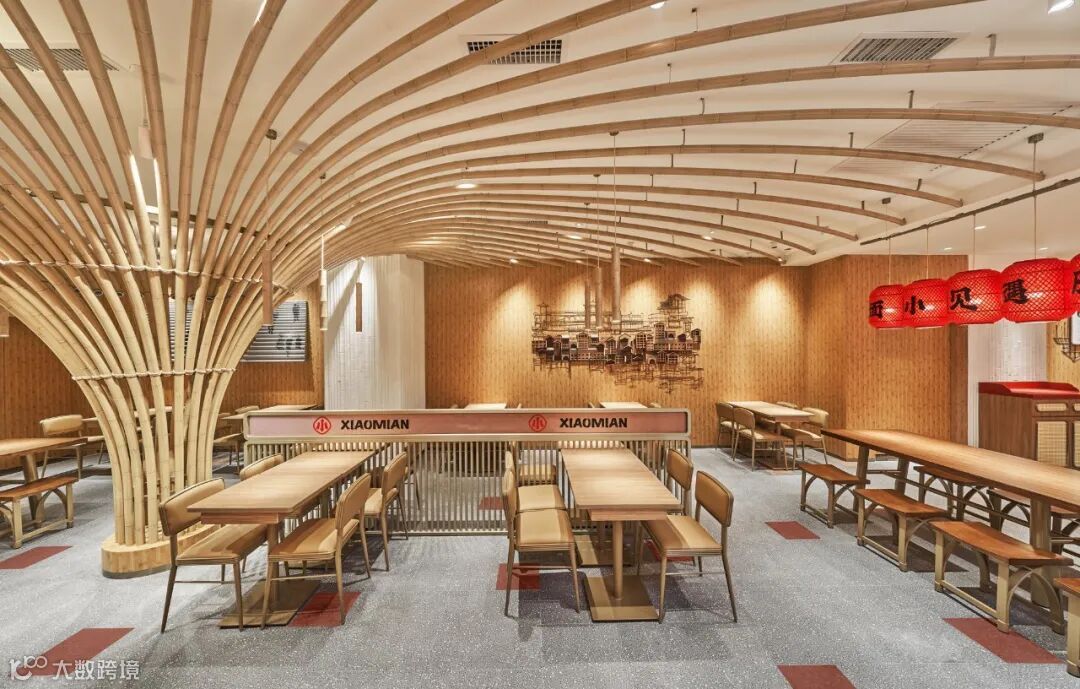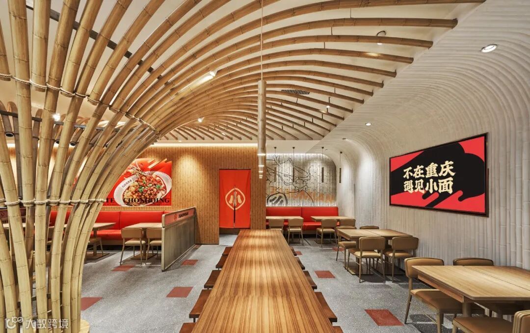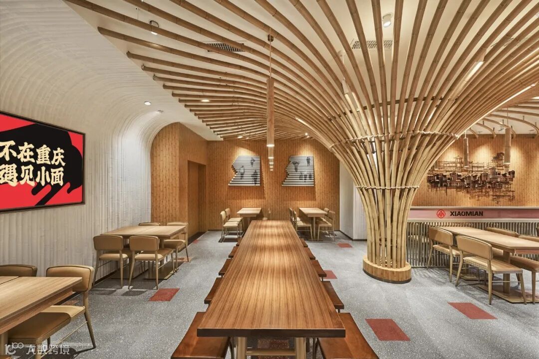 一个空间里的文化始终还是要由空间里的材质组织而来,为了能让一个实体空间里的川渝文化看得到、能摸得到,我们发现,竹子是当地非常显性的一种材质。回想武侠巨制《十面埋伏》里在竹海中一幕幕潇洒的穿梭,而这些屏幕背后的竹林取景则正是来自重庆永川的竹海。而且重庆当地人在生活中也一直在使用很多用竹子打造的家具,是那么的惬意。所以,遇见小面的空间中我们也运用到了大量的竹子元素,让整体散发出重庆原始、自然的气息。
