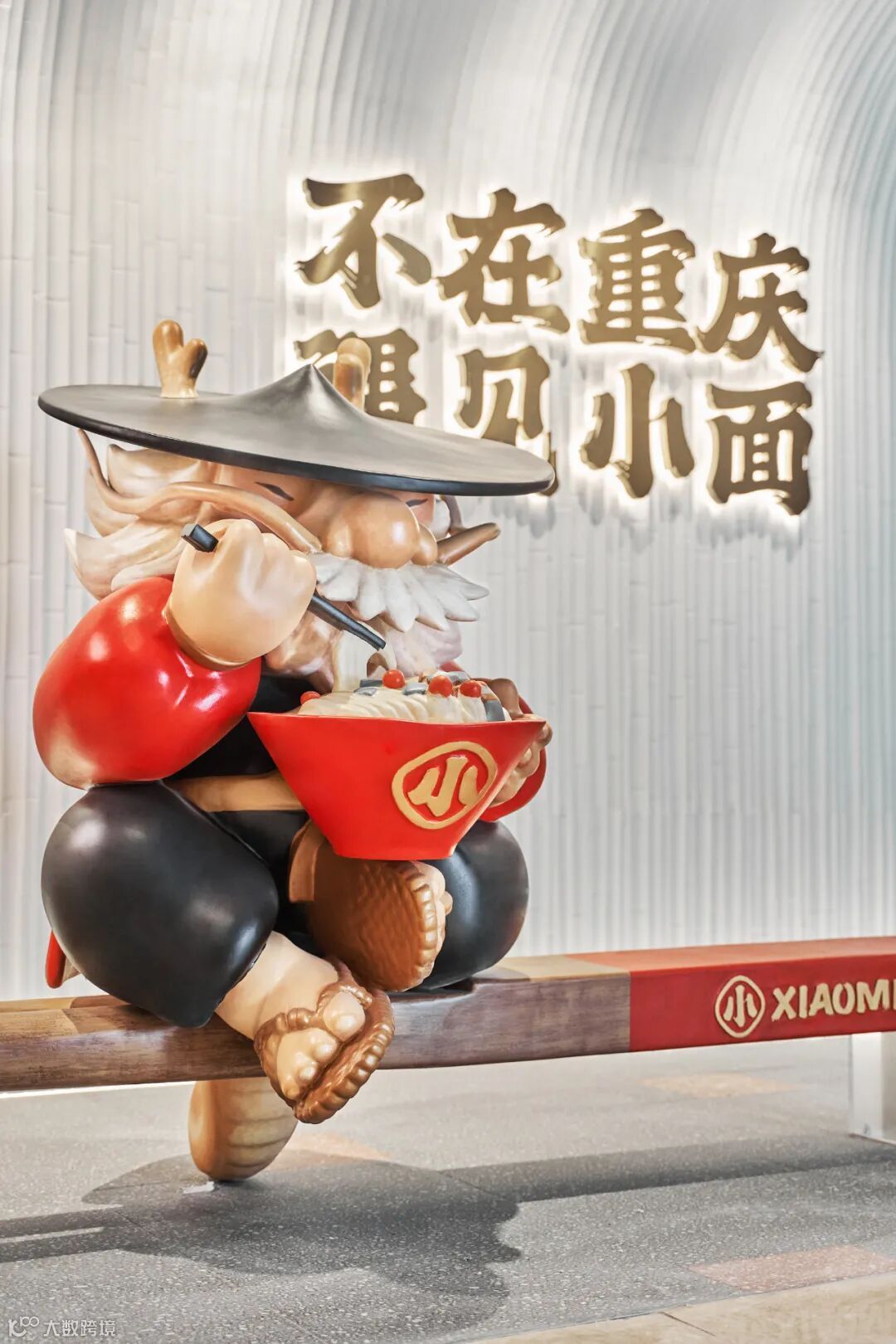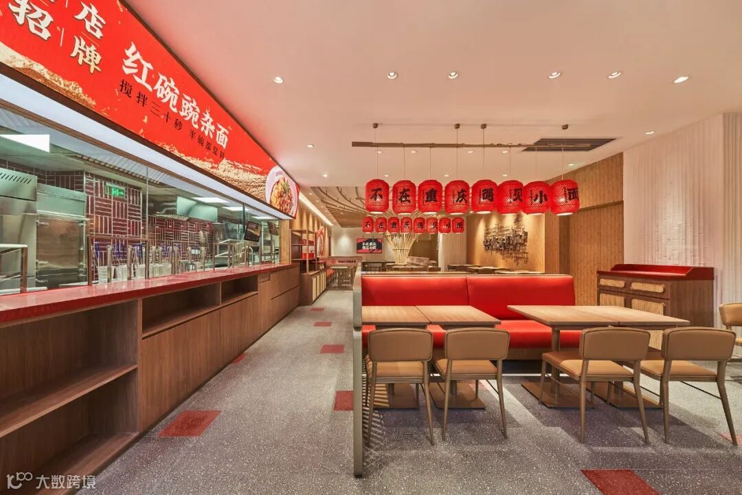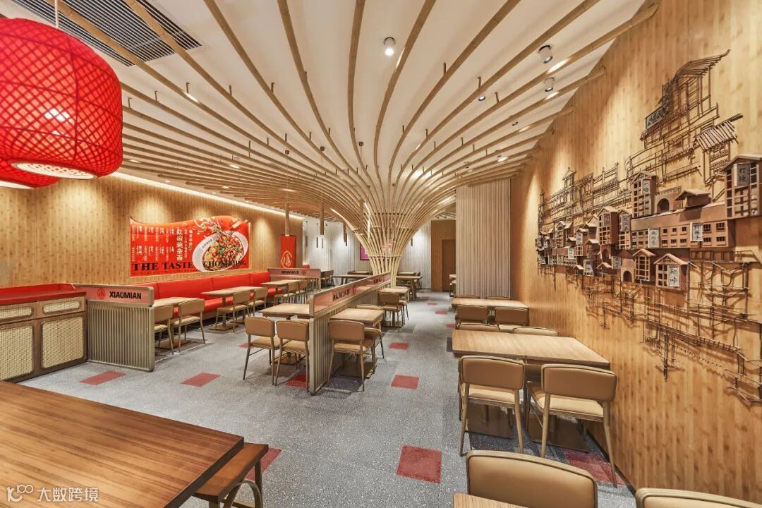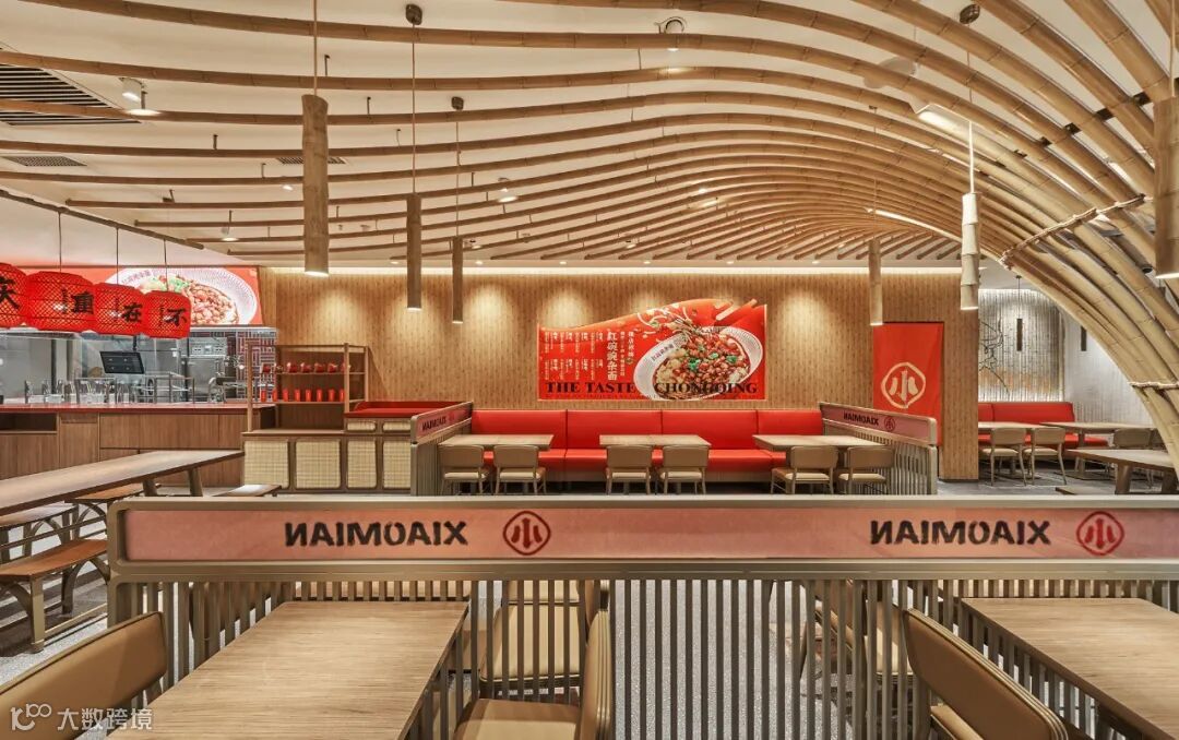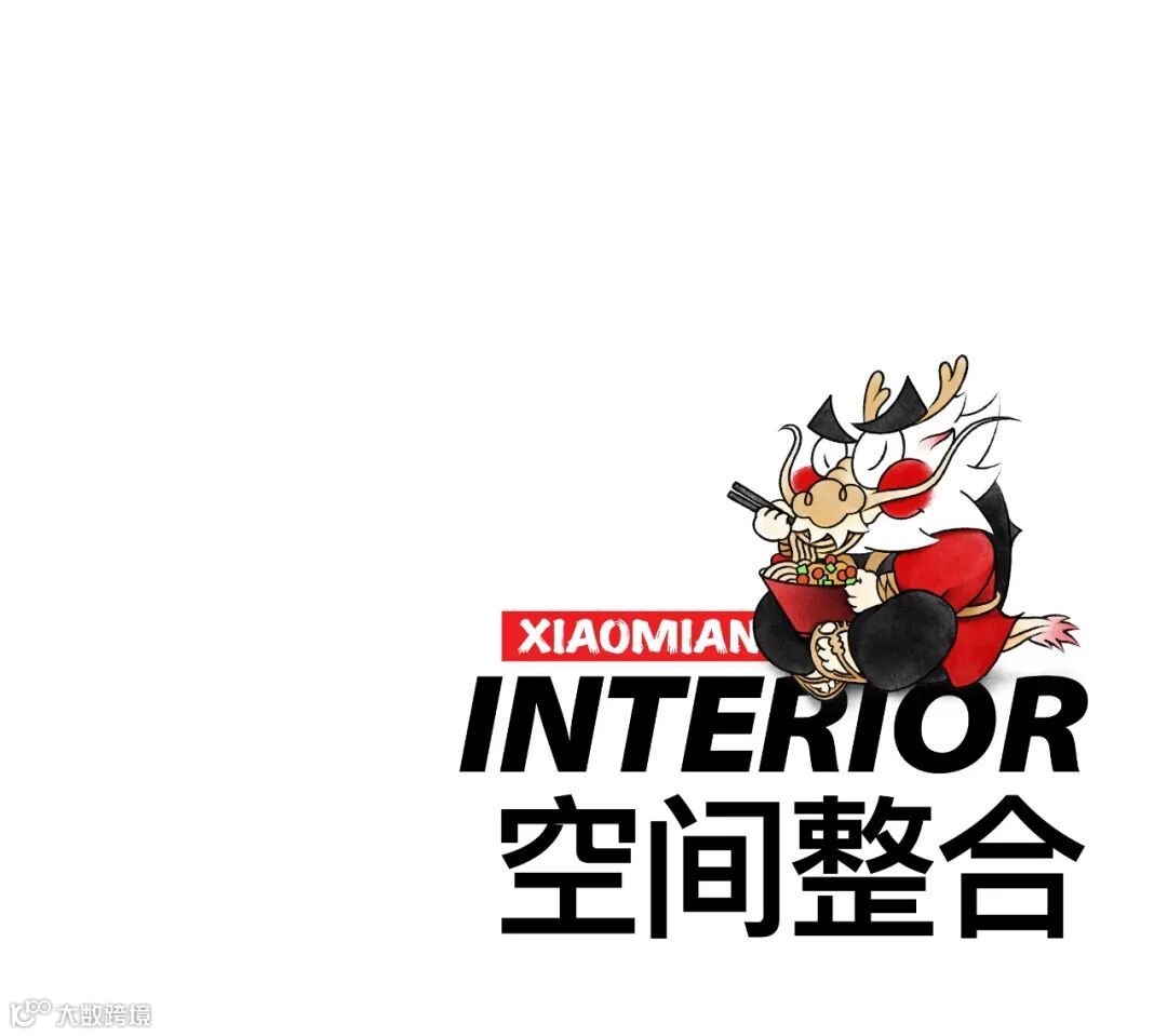 一个品牌空间的重要使命也要能将品牌文化的美好传递给更多的人,因此在空间的表达上我们设置保留了重要的品牌故事、IP形象和品牌纹样等元素,我们也让遇见小面的品牌 IP 渝小龙和等位区结合,增加互动,告别了传统等位区单调乏味的等位体验,让等位区也能变成 IP 打卡新地标。