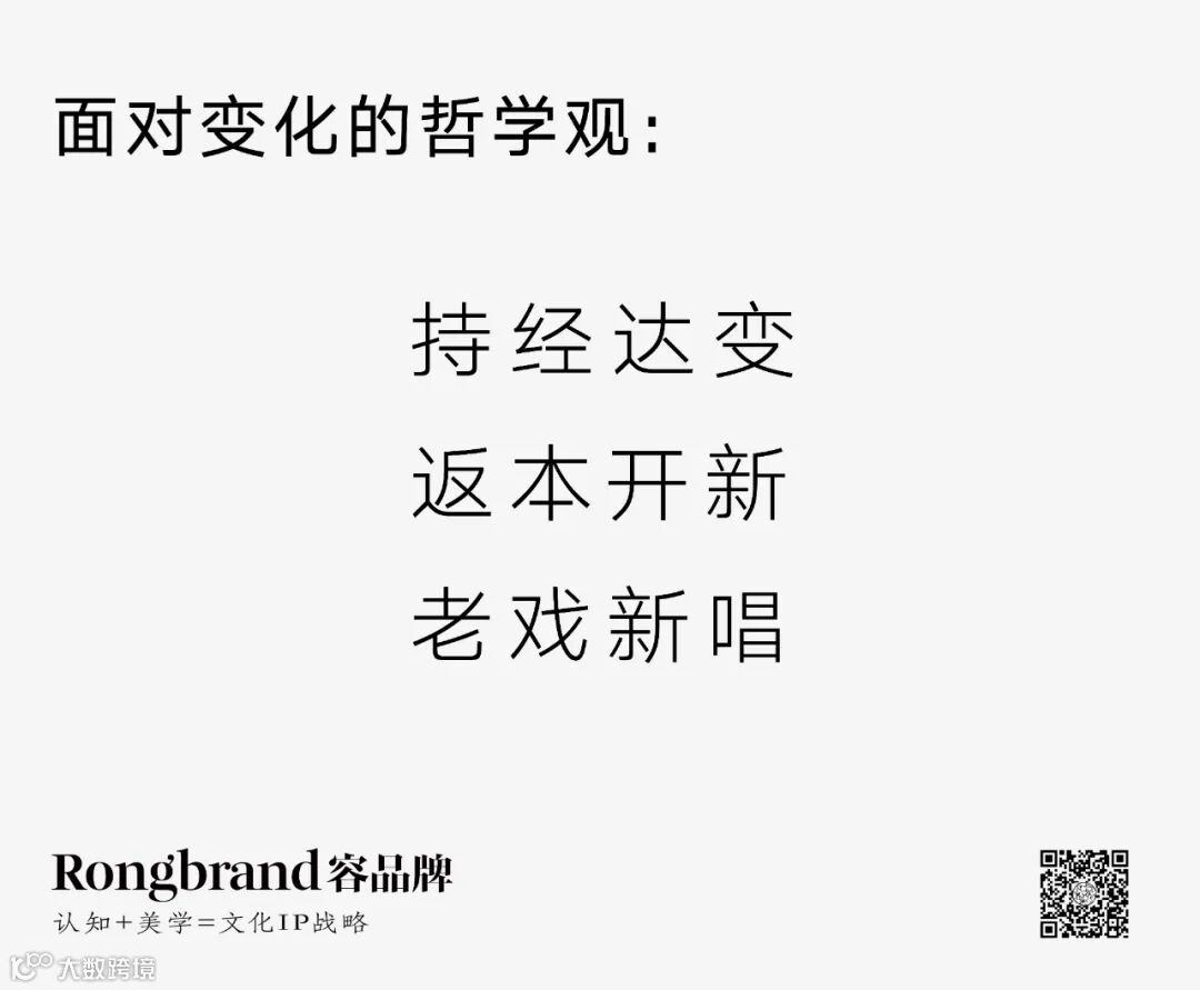 “持经达变、返本开新、老戏新唱”,一直以来这都是我们东方文化中应对变化的高明之处。文化之于品牌,其实既不是激进的反对潮流,也不是一味的固守不变化,为了表现文化而去做文化,而是能让品牌既能保持住自我的根本,也能与瞬息万变的时代和谐相处,不会让品牌在不断的变化中迷失方向,不知所措。