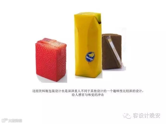 如果他对“果汁包装”的本质目的停留在惯性思维,包装应该有诱人画面的图文装饰设计,就永远不会诞生这个作品,他敢于拷问本质:“只要表明这是果汁的一切可能性”,所有已有的惯性思维都是可以颠覆的,所以才有了这个颇有禅意,又超越一切图文装饰诱惑力的包装