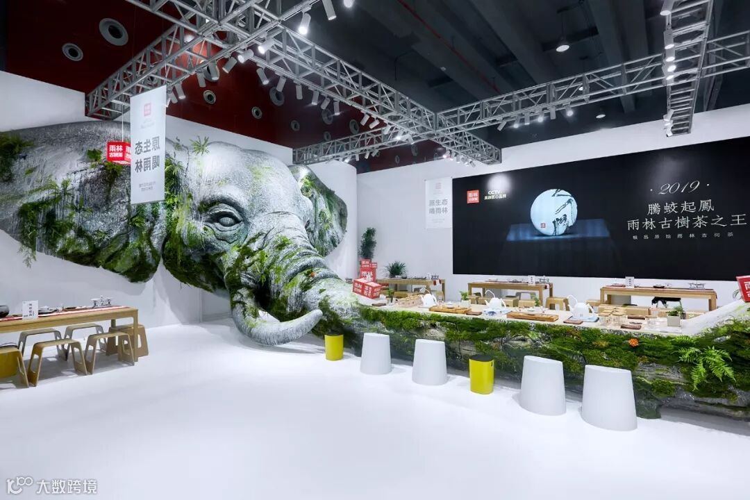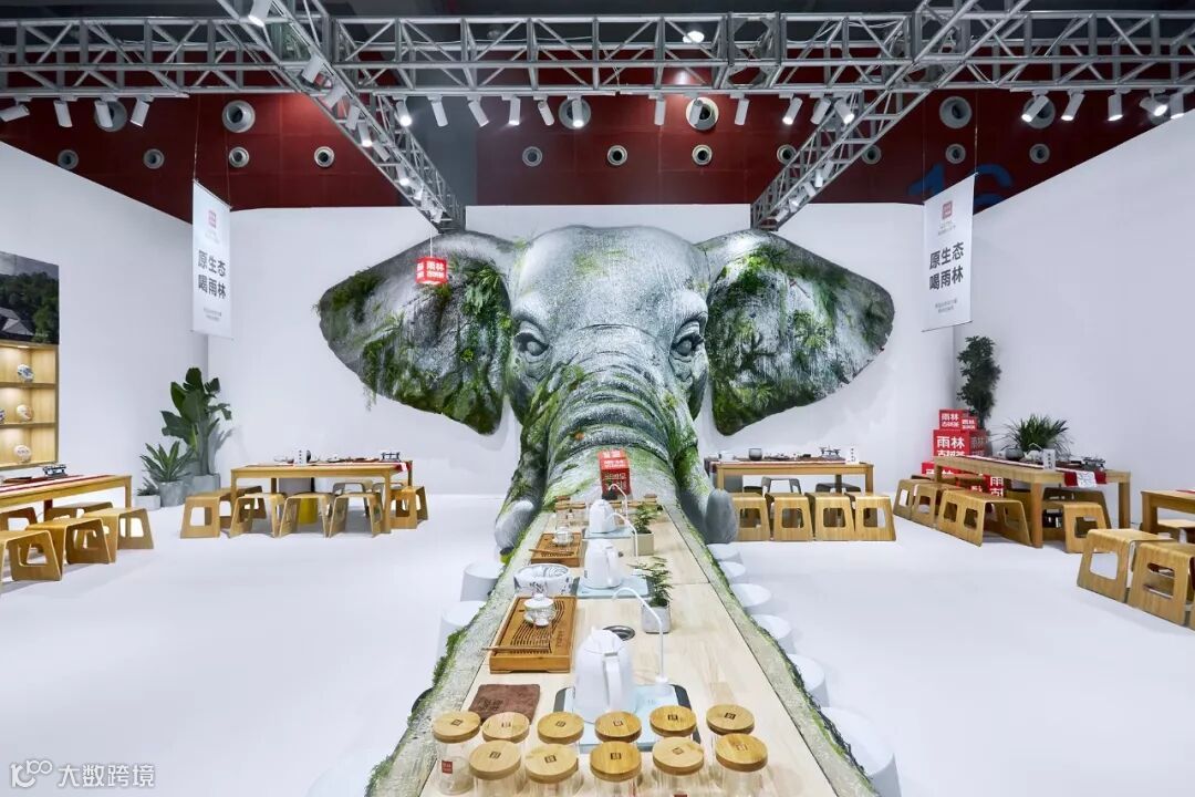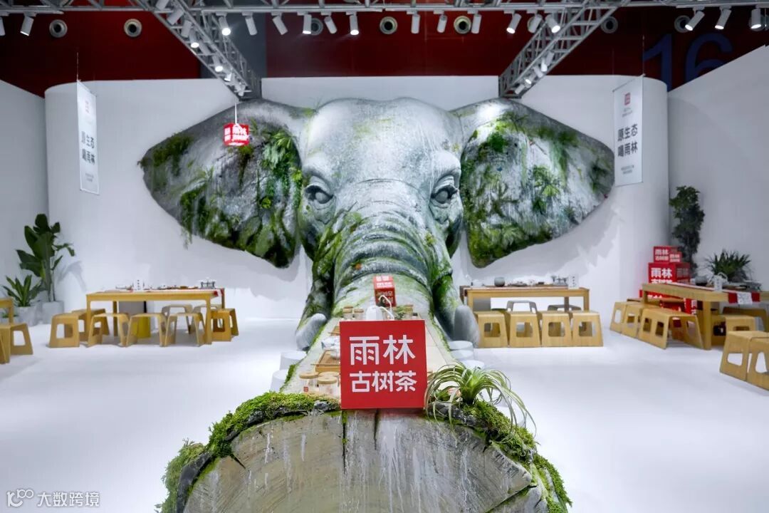 整体呈现出“山中有象、象中有山、茶在山中、山中有茶”的神奇状态,整个空间形成一个“云南动植物王国”的缩影。消费者看到大象、古茶山、百年古树,就能直观感受到云南西双版纳原始雨林的“原生态”。