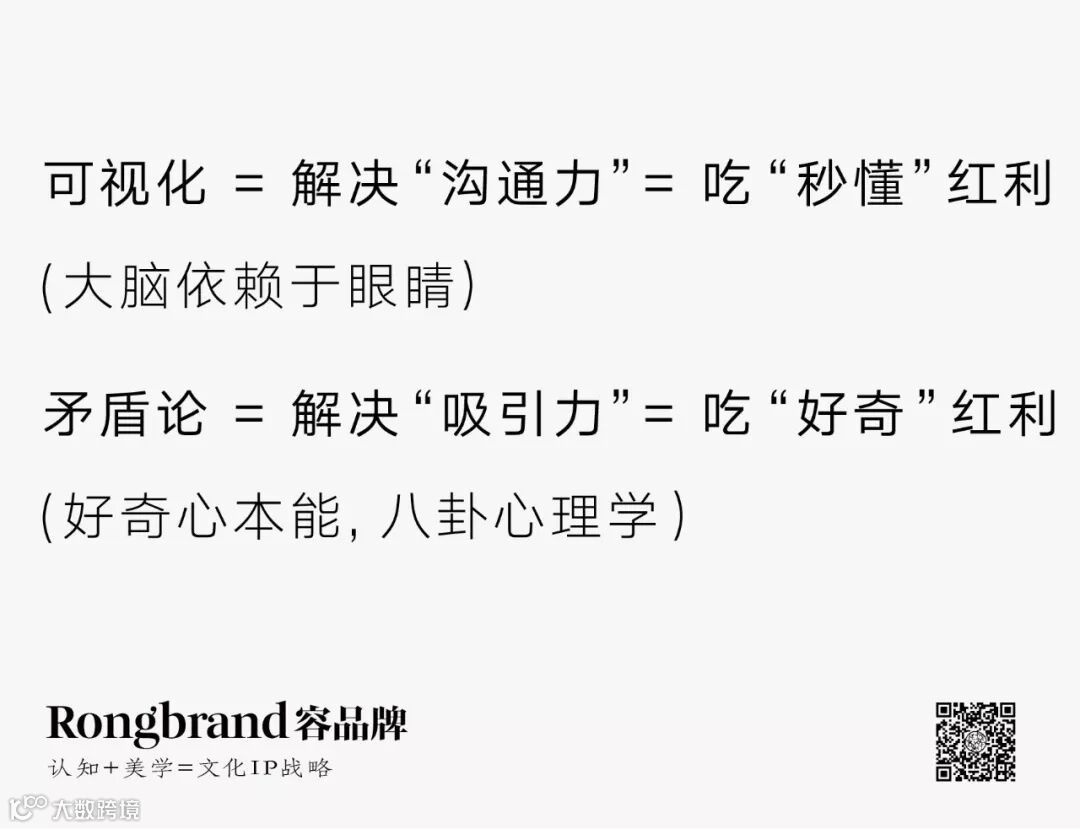 一个品牌/产品,如果同时拥有“可视化”和“矛盾论”,那就相当于自带沟通力和调动好奇心的能力,自带吸引力。