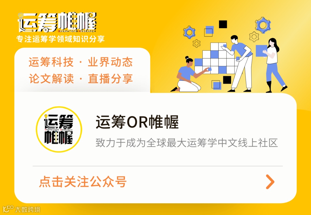 以运筹学为圆心,辐射数据科学、人工智能等领域,【运筹OR帷幄】社区旨在为读者带来运筹学/优化理论最专业和前沿的资讯与报道,及其在供应链管理、人工智能等学科的交叉应用。旗下求职和留学资讯平台【运筹Offer】,聚焦运筹学、大数据、AI等领域企业招聘、实习内推、职场经历分享以及海外本硕博申请咨询。扫码关注,精彩内容每日推送~
