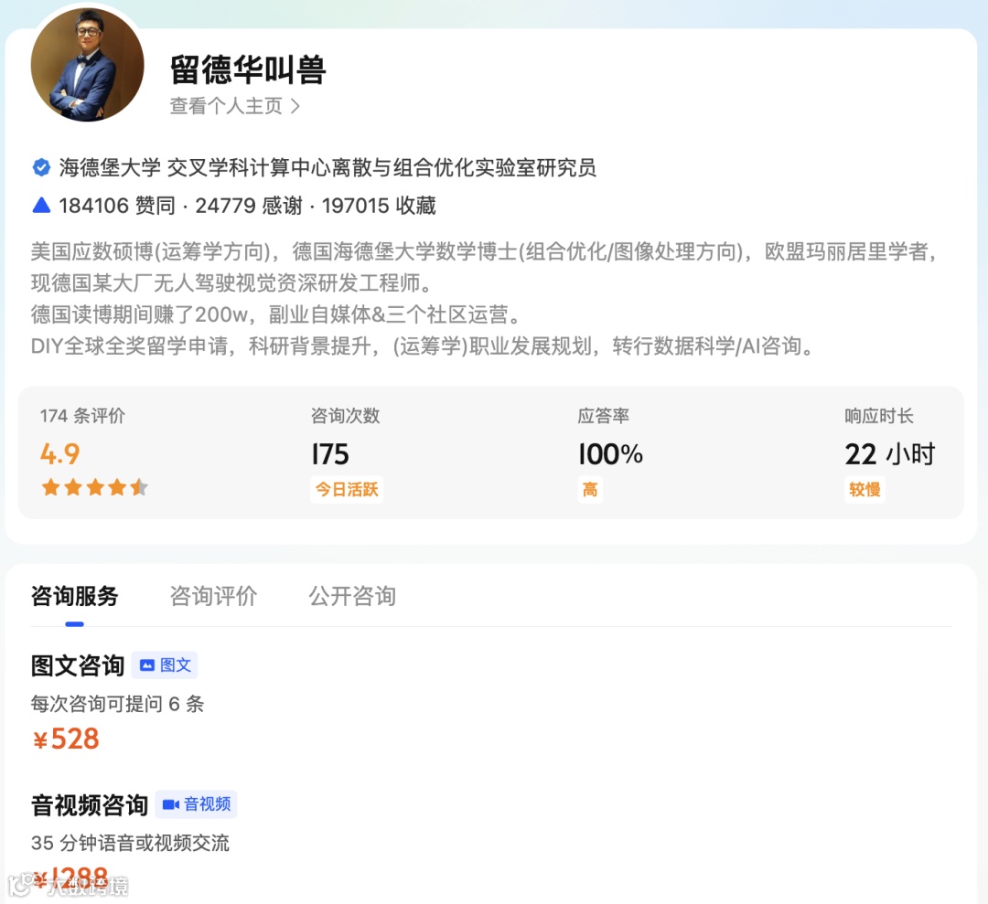@留德华叫兽 是【DIY飞跃计划】留学|科研社区创始人,美国Top 50 运筹学硕博留学三年,后跳槽至欧盟玛丽居里博士项目,于全球Top 50 德国海德堡大学人工智能方向获得数学博士学位,期间前往意大利博洛尼亚大学、IBM实习半年,巴黎综合理工访问一季,现于德国某大厂自动驾驶部门资深研发工程师。已累计帮助不下200位学员成功DIY飞跃。
