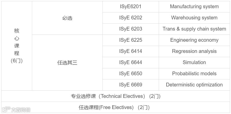 在专业选修课方面,项目要求学生,根据选课列表,在ISyE和其他院系(例如计算机系,数学系等)中,选择与制造和物流方向相关的课程,不在列表中的课程,需要经过advisor同意才可选择。除此以外,任选课程不受限制。具体培养方案如下表1所示。