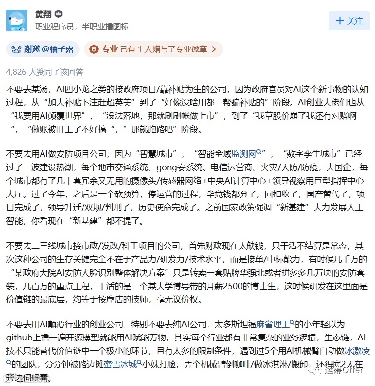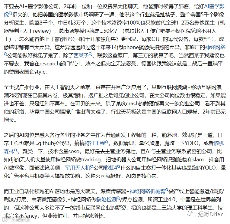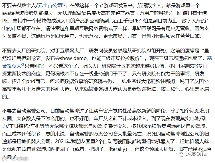 前面泡沫大,大家看到的都是“钱多”,“活好”,“高大上,有面子”,一窝蜂的往里面挤,最离谱的,经常能看到包括机械,生物等专业顶尖院校的博士毕业后转这个方向,放弃了自己多年所学,转过来做一些label工作(也不算夸张,这一行大部分时间不都在搞数据嘛),但是因为巨大的行业差距,一时不适应,很长时间无产出而黯然离场。