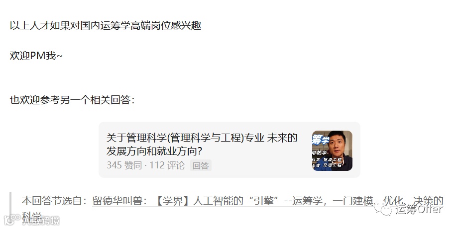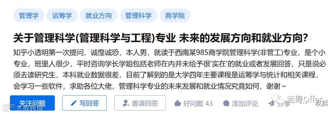 而前面提到管科真正硬核的东西就是数学和CS,等上了硕士博士很多管科出身的童鞋其实自己已经意识到这个问题了。如果对很软的管科不感兴趣,建议转型硬核一点的管科,例如运筹学,数据科学,关于运筹学和数据科学就业方向之前我也谈过很多了