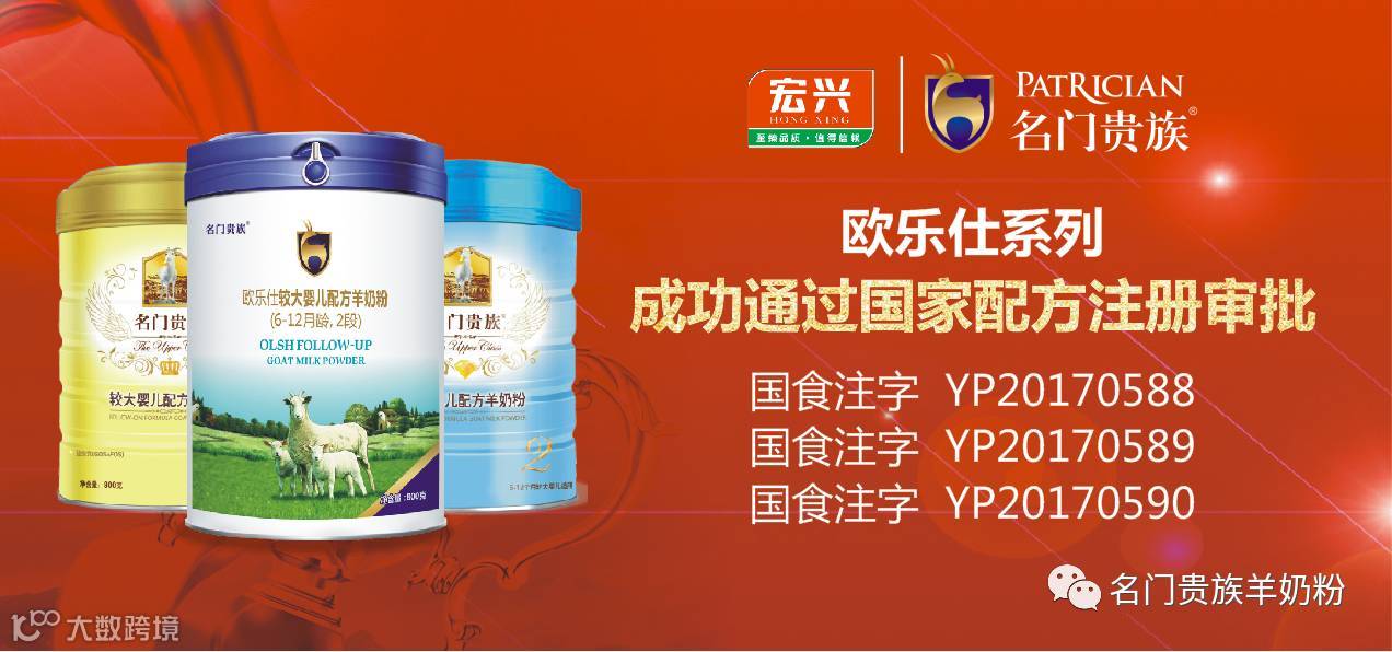 要闻:2017年12月05日,国家食药监局公布了婴幼儿配方乳粉配方注册名单,此次配方注册共有10家企业共40个品牌通过,宏兴•名门贵族系列婴幼儿配方羊奶粉榜上有名。宏兴•名门贵族全新升级到欧乐仕配方系列,新包装,新视觉,新气象,展示给大家!