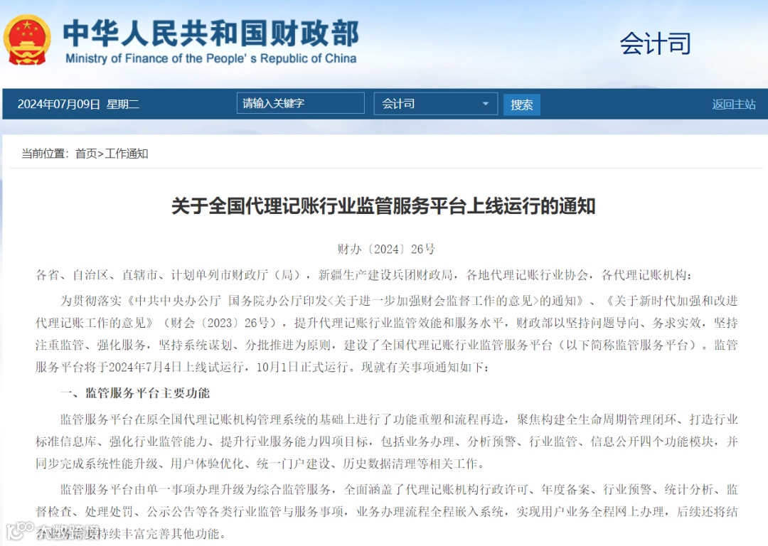 7月3日,财政部发布《关于全国代理记账行业监管服务平台上线运行的通知 》