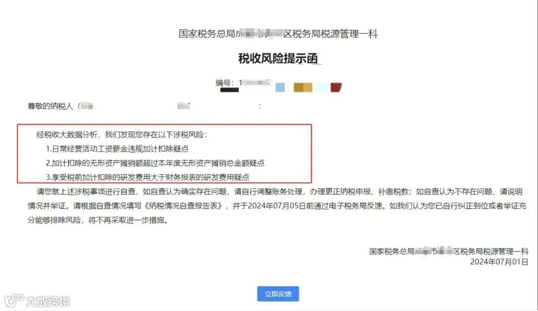 1、因疑违规加计扣除被风险提示