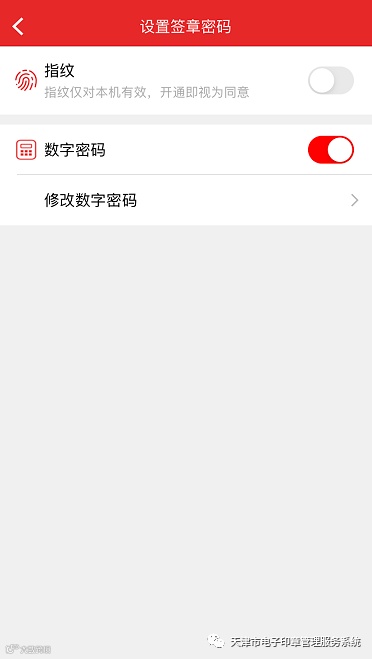 点击“我的”-“设置”-“修改签章密码”-“数字密码”(或点击其它功能时,在弹出框“您还未设置签章密码,请设置”中点击“去设置”),自行设置数字密码。