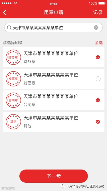 1. 点击“用章申请”,在搜索框内输入单位名称或统一社会信用代码,选择单位信息,查看本单位备案通过的电子印章。选择需要使用的电子印章(可多选),点击“下一步”。