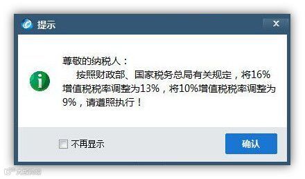 1.2019年4月1日至3日,进入开票软件,系统自动弹出“按照财政部、国家税务总局有关规定,将16%增值税税率调整为13%,将10%增值税税率调整为9%,请遵照执行!”的提示 ,如勾选左下角的“不再显示”后,再次登录开票软件不再弹出该提示框。