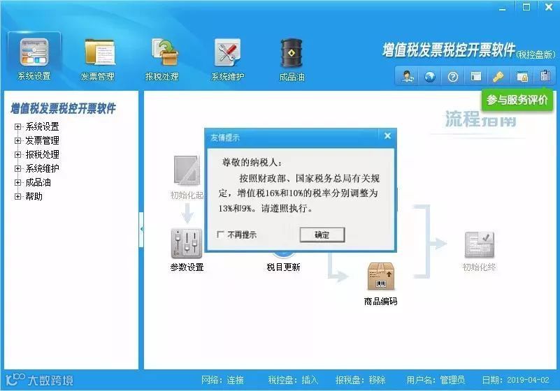 1.2019年4月1日-4月3日登录开票系统均会提示“按照财政部、国家税务总局有关规定,增值税16%和10%的税率分别调整为13%和9%,请遵照执行”, 如勾选左下角的“不再显示”后,再次登录开票软件不再弹出该提示框。