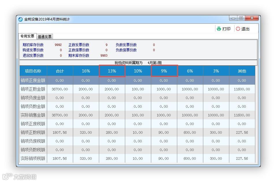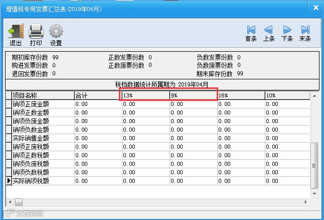 4.月度统计表和发票资料统计中增加对13%和9%税率的汇总统计。