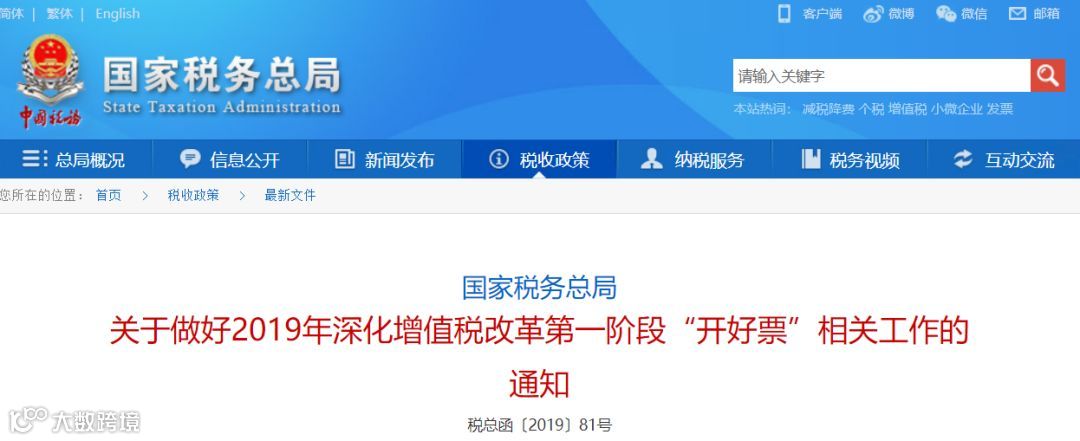 税总函[2019]81号国家税务总局《关于做好2019年深化增值税改革第一阶段“开好票”相关工作的通知》: