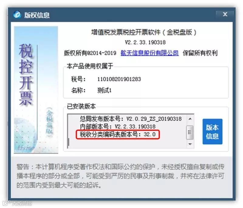 2.升级后在2019年4月1日后登录开票软件时税收分类编码自动更新至最新版本号32.0。