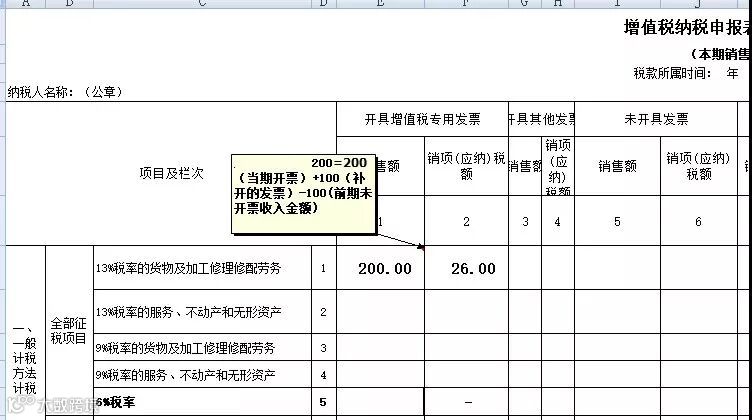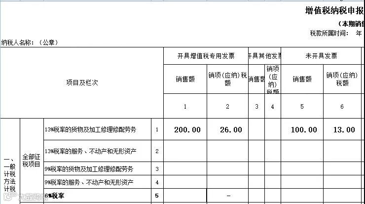 比如一般纳税人,当期取得100的未开票不含税收入,税率13%。开专票收入还有200(不含税),税额26。那么填表如下,当期的未开票收入和税额填写到附表一的5、6列。