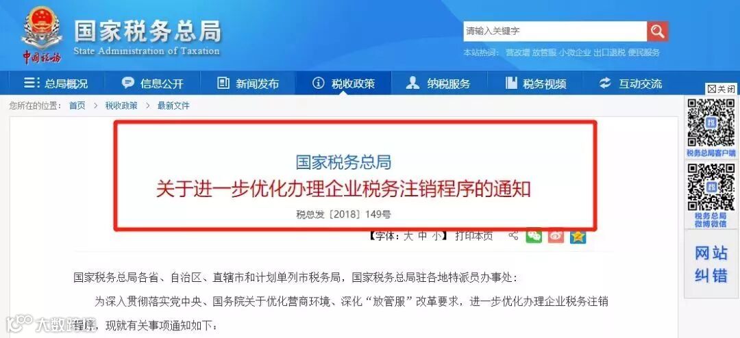 早在去年9月份,国家税务总局就发布了《关于进一步优化办理企业税务注销流程的通知》(税总发[2018]149号),《通知》明确2018年10月1日起,企业注销流程大大简化!