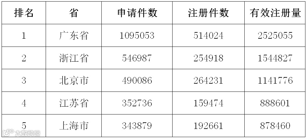 从商标局公布的2017年度全国各省、自治区、直辖市商标申请与注册统计表来看,广东省商标申请件数高达109.5万件,占据全国数量五分之一,高居全国榜首。同时,广东省有效注册量为252.5万件,遥遥领先于各省市。