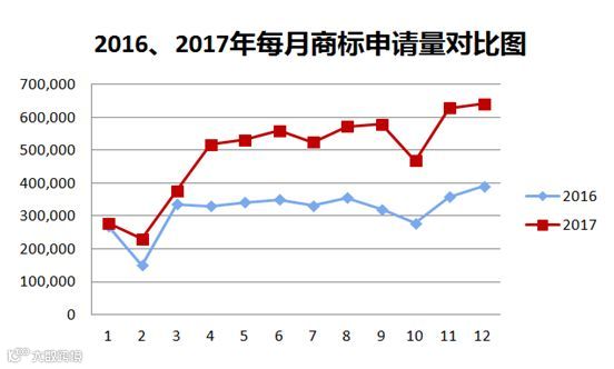 2017年我国商标注册申请量突破500万大关,达到574.8万件,比上年增长55.7%,申请量和增速均创历史新高。