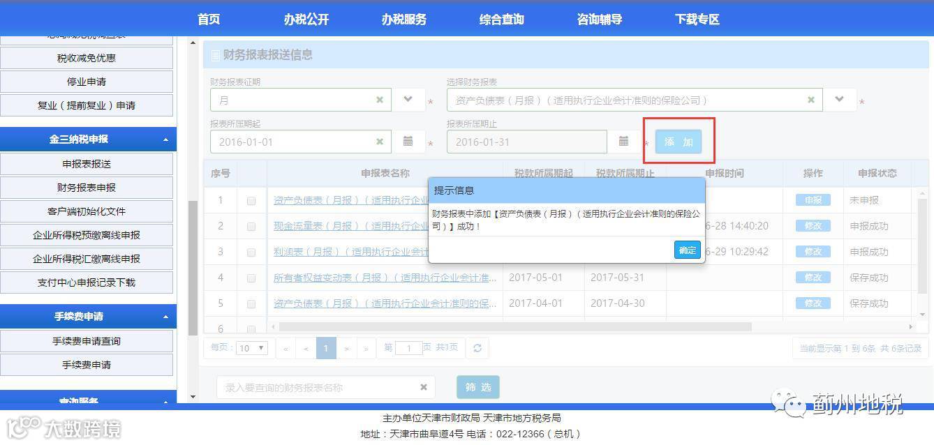 3.在【财务报表属期起】中选择往期要申报的财务报表及对应属期起日,点击【添加】按钮后,会在列表中生成一条往期财务报表记录,点击对应记录中【申报】按钮即可进入财务报表页面进行数据填报。