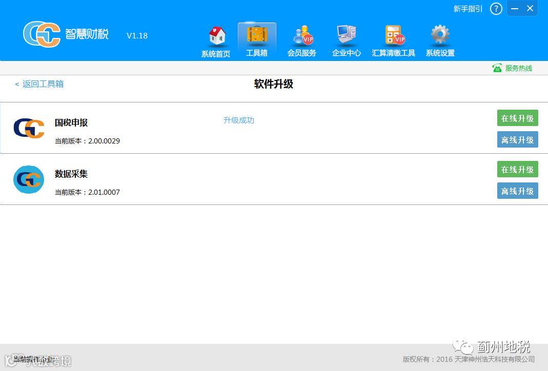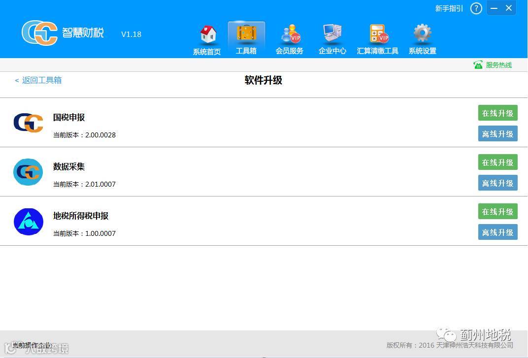 打开智慧财税软件,登录企业后,选择“工具箱”-“软件升级”,分为在线升级和离线升级,如图1.2.1所示。