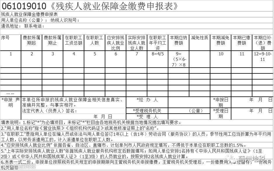 《残疾人就业保障金缴费申报表》表样及填表说明