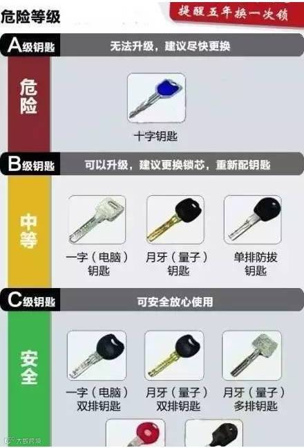 老式的十字钥匙和单片钥匙都属于A类钥匙,用A级钥匙的锁很容易被打开。选择C级钥匙是防盗的有效方法。