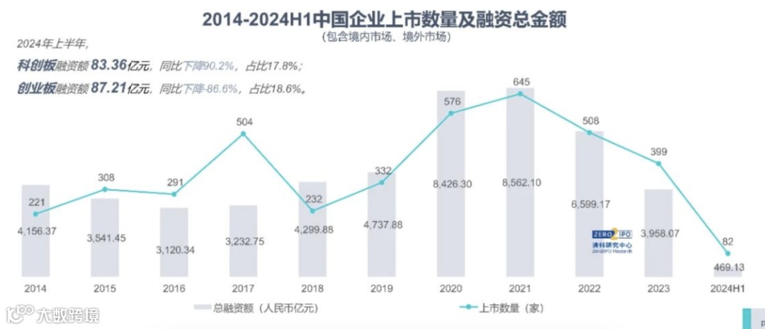 清科研究中心最新报告显示,2024 年上半年,中国股权投资市场退出情况并不乐观,共发生 746 笔退出案例,同比下降 63.5%。主要受 IPO 门槛提高、上市企业流动性降低、企业估值较低且增值速度慢、被投企业无力回购、活跃买方数量少等五个方面影响。其中,风险投资(VC)和私募股权投资(PE)较为依赖的退出路径 —— 首次公开募股(IPO)渐渐变得遥不可及。2024 年上半年仅有 82 家中企上市,同比下降 62.4%,境外和 A 股被投企业 IPO 案例数同比分别下降 20.1%、74.1%。