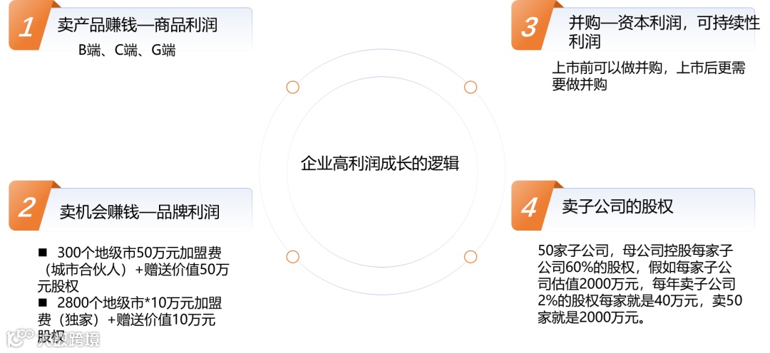 打造一个高估值的企业,离不开科学合理的资本顶层结构设计。假设我们要打造一个估值 100 亿元的企业,按照市盈率 100 倍来计算,那么企业需要实现利润 1 个亿。我们可以将这 1 个亿的利润进行拆分,分别通过卖产品、卖机会、做并购、卖股权这四种方式,每种方式实现 2500 万元的利润。在企业上市之前,市盈率通常为 30 倍,如果要达到 30 亿元的市值,企业可以先将自身估值设定为 10 亿元,通过融资 20 亿元来实现这一目标,这就是资本顶层结构设计的基本逻辑。