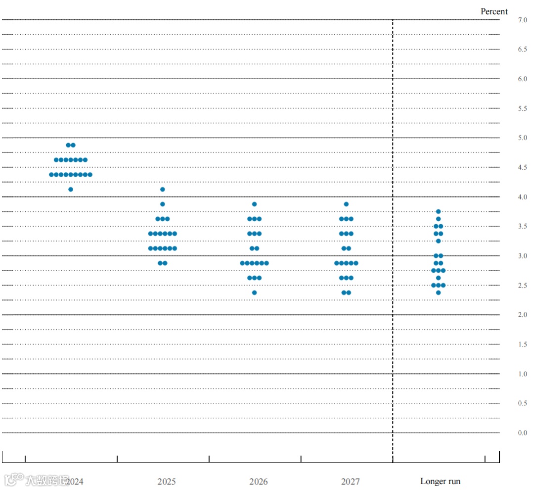 联邦公开市场委员会参与者对适当货币政策的评估聚焦于联邦基金利率目标区间或目标水平的中点。此次降息一经落地,美联储便同步对未来联邦基金利率水平予以下调。就 2025 年的联邦基金利率而言,其利率中值预测从 6 月的 4.1%下降至 3.4%。对于 2026 年的联邦基金利率,利率中值由 6 月的 3.1%降至 2.9%。而长期中性利率的预期值则从 6 月的 2.8%上升至 2.9%。值得一提的是,点阵图的预测仅仅代表着美联储官员当前的预测情况,其往往与真实的利率政策路径存在差异。