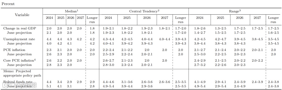 美联储同日发布的点阵图显示,对2024年的联邦基金利率中值的预期为4.4%(6月预期值为5.1%),这暗示美联储有可能在年底前再降息50个基点。
