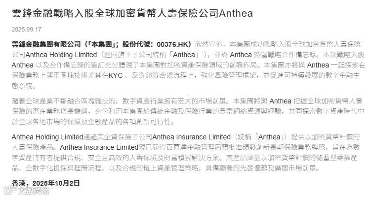 近期,与马云关联的云锋金融动作不断,尤其在 Web3 与区块链领域密集布局 ——10 月 2 日,公司宣布战略入股全球加密货币人寿保险公司 Anthea Holding Limited,双方计划携手探索区块链技术在保险业务的落地,重点优化 KYC(客户身份识别)、反洗钱等合规流程,目标是搭建更可持续的数字金融生态。