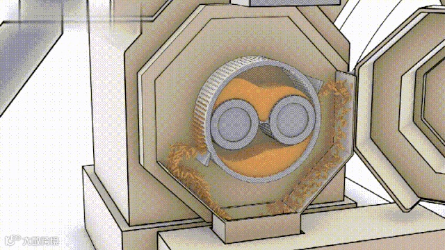 利用环模和压辊的强烈挤压作用, 将物料逐渐挤入环模的模孔中并在模孔中成形,由于物料在模辊之间的连续挤压,成形后的料从模孔中不断呈柱状排出,然后由切刀切成所需