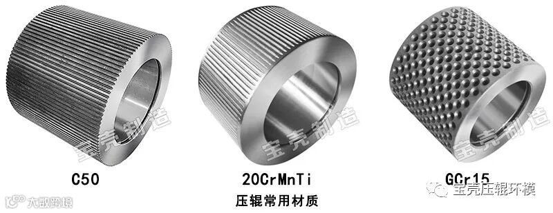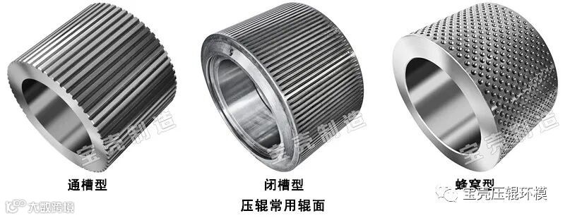 颗粒机在制粒过程中,为了确保可以将原材料压入模孔,压辊与物料间必须要有一定的摩擦力,所以在制作压辊的时候,会设计为不同形式的粗糙表面,以防止压辊打滑,目前应用最为广泛的辊面有3种:通槽型、闭槽型、蜂窝型。