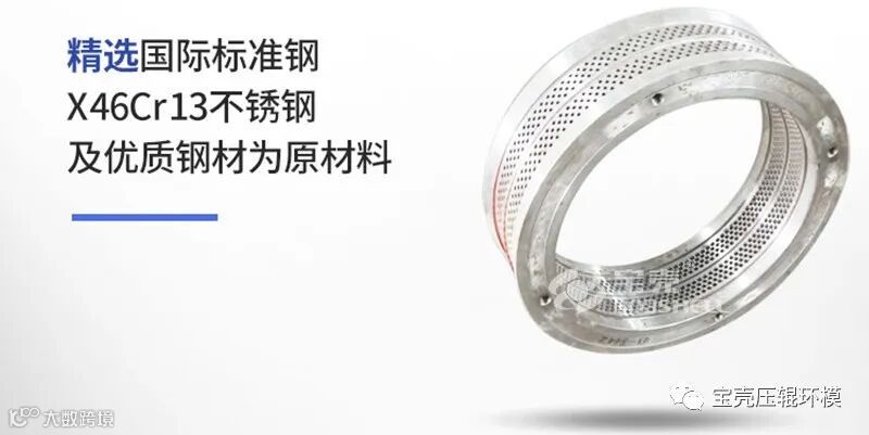 宝壳环模精选国际标准钢X46Cr13不锈钢及优质钢材为原材料,全进口意大利高速枪钻打孔,精湛的高温真空淬火工艺,保证模具硬度层,使用寿命是国内市场普通环模的2倍。