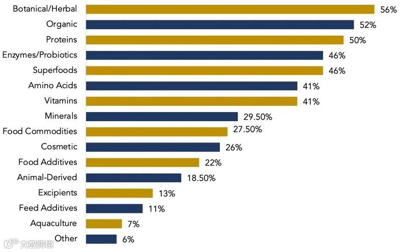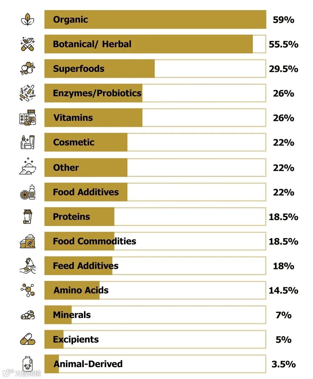 • 最受买家关注的原料:植物/草本(56%)、有机(52%)、矿物质(29.5%)、化妆品原料(26%)……我们将精准对接买家需求与卖家供应,你的品类越热门,受买家关注越多。