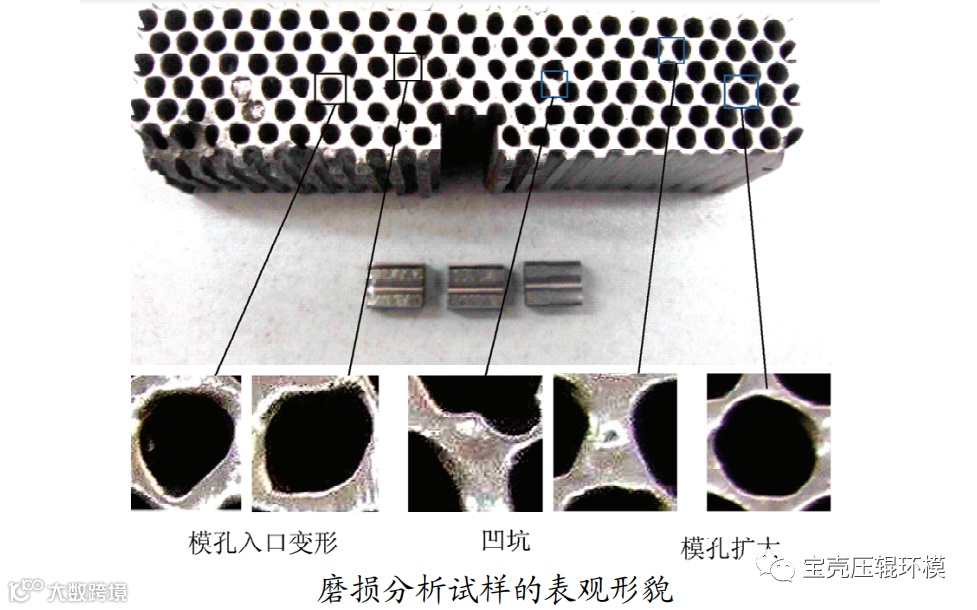 环模的主要失效形式是磨损,其次是疲劳破坏,有团队对此进行了实际生产状态下的磨损试验:对环模内壁和模孔内壁的磨损量与表面硬度进行测量;对磨损面进行表观形貌和微观磨损形貌观察;从宏观和微观角度对磨损机理进行分析。
